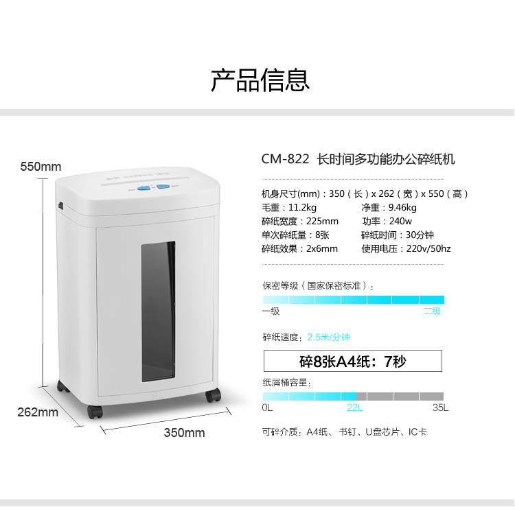 科密CM-822办公碎纸机 8张/次 30分钟 22L