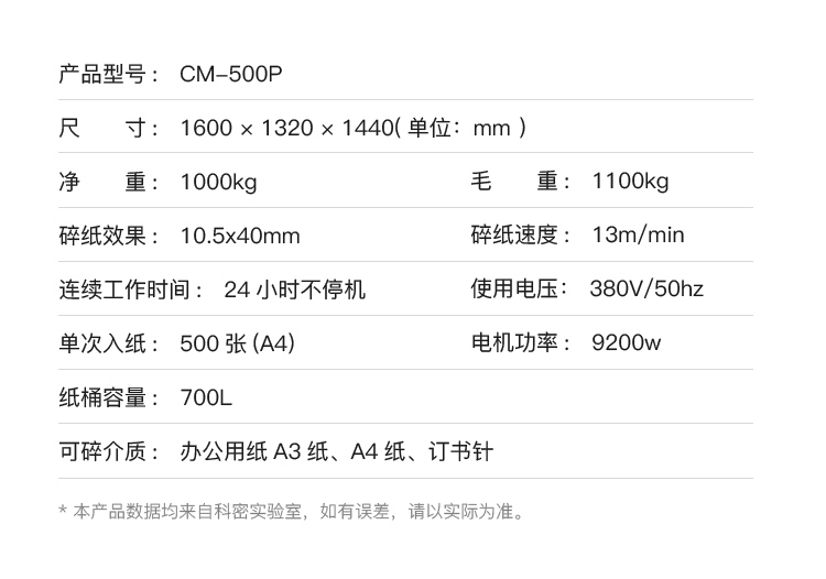 科密CM-500P 商用碎纸机500张/次连续不停机700L