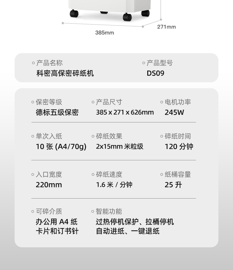 科密DS09 120分钟连续碎10张5级保密碎纸机